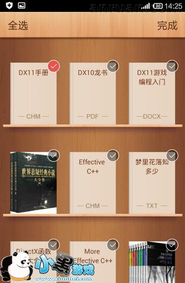 1、打开掌阅主界面后,用手指长按住其中一本图书不放,直到所有图书右上角出现小勾,如下图所示。