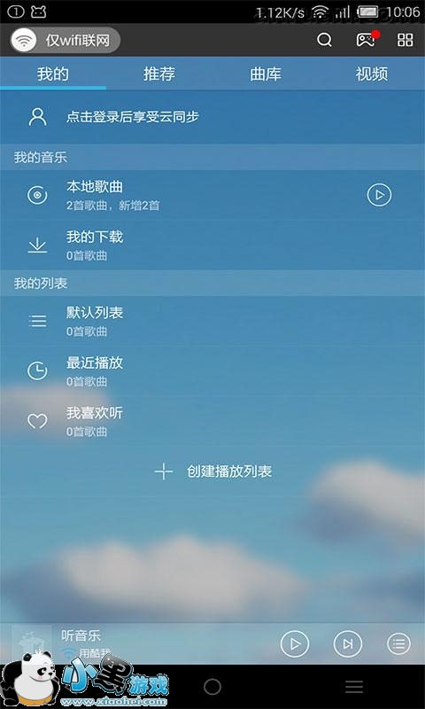 1、首先,我们下载小黑市场的酷我音乐,打开以后进入主界面,我们可以选择一直右侧滑到侧边栏,也可以点击右上角的唤出功能栏