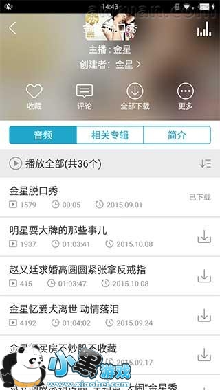 3、找到喜欢的节目以后,例如:小编选择的脱口秀节目,根据不同主播进入,就能看到他的脱口秀节目,如果我们想要下载,只需点击节目后面的下载按钮加入下载队列,因为是音频文件,所以很快就下载完毕了。