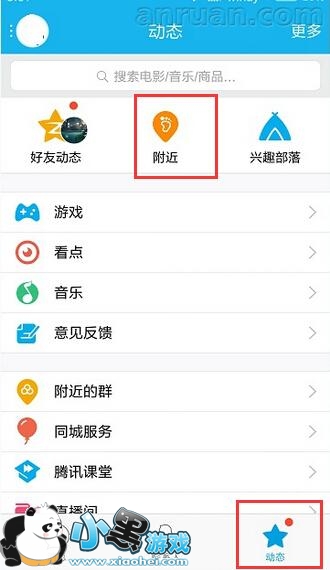 2、然后,打开QQ【动态】,选择【附近】