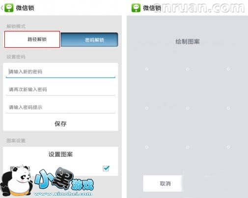 选择“路径解锁”,设置图像密码。这样在登陆微信的时候,会让你输入图像密码。
