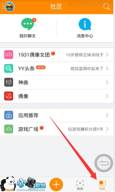 1、首先在手机YY页面点最下面的那个社区,然后点击上面的“我的聊天”。