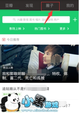 1、打开豆瓣客户端,进入手机豆瓣主界面,可以看到主界面上方有四个功能菜单,选择其中的圈子菜单进入。