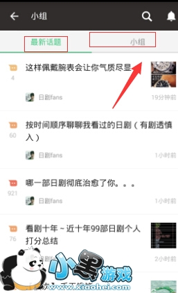 3、打开小组选项以后,进入到小组界面,这时小组界面也有两个功能菜单选择,一个是最新话题一个是小组,我们要找的是小组这个功能,点击进入后,会有系统根据你的兴趣标签推送的小组,找一个进入关注。