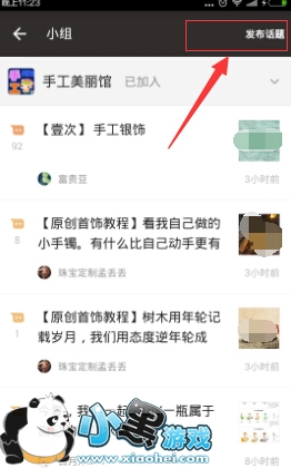 4、进入到关注的小组界面后,点击右上方的发布话题按钮,点击进入。