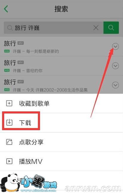 2、找到该歌曲后,歌曲右边有一个倒三角的标识,点击该标识会弹出一个下拉框,下拉框中会出现相应的功能选择, 找到我们要找的下载按钮,点击下载。