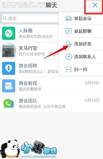 1、在小黑市场下载好微会,打开微会客户端进入微会主界面,找到最下方四个功能中好友这个选项,点击后会进入到一个聊天界面,聊天界面右上角有一个“+”符号,点击后有几个选项,找到我们要找的添加好友这个功能。