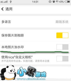 3、进入通用设置的界面后,里面有一些功能可以选择,里面就有一项是本地图片加水印,默认这个功能开启的,我们要做的就是把这个功能给关闭掉,点击一下红框中黄色的按钮就关闭了,如下图所示。