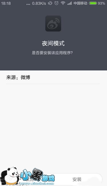 6、当我们安装成功以后,我们的新浪微博客户端就会自动进入到夜间模式了,对于那些晚上睡觉前要刷会微博的人来说很能保护我们的眼睛。如果你要退出夜间模式的话,只要在设置中心菜单中将夜间模式按钮关闭就可以了,下次要是还想使用夜间模式的话,只需要点击一下按钮来回切换就可以了。