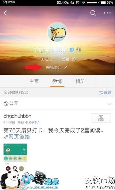 5、点击进入后,新浪微博会弹出界面,里面有我们当前的昵称,编辑我们需要修改昵称换成我们要设置的昵称。