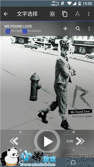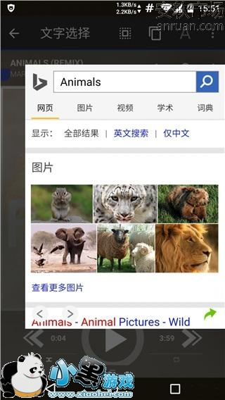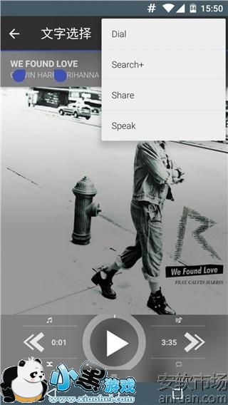 如果你想要翻译的单词并不能通过长按来选取,Text Aide 提供了双击选择的功能。例如在音乐播放器中,双击歌曲标题中的某一单词同样可以弹出顶部操作栏,其中位于右侧的菜单按钮可以打开 Text Aide 的其他功能,例如刚才设置的在线搜索、发音等。