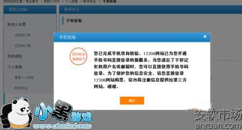 在我们登陆12306帐户后,我们发现页面弹出一个“手机双向验证”的窗口,这里我们点击这个窗口中的“确定”。