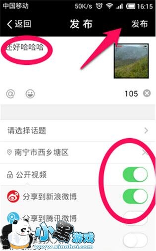 6、输入视频描述,然后选择是否分享到微博,再发布。