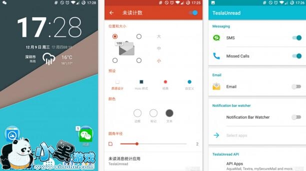 未读消息 虽然 Android 5.0 就已经对通知栏做了很多优化,不会再出现通知栏「排排坐」的现象,但是很多人还是更喜欢 iOS 的角标提醒。由于 Nova Launcher强大的兼容性,我们只需要配合 TeslaUnread 或者 Missed It插件,即可达到相同的效果,并且还可以选择角标的位置、颜色、样式,排除不想被提醒的应用,只对特定应用开启提醒。