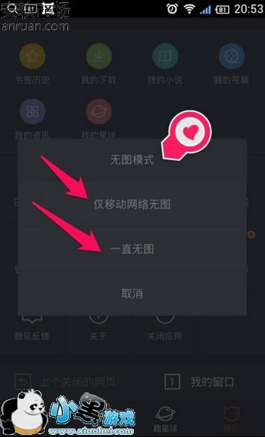 3、当你点击“开启无图”这个功能之后,会弹出一个对话框,而我们只需要选择其中会用到的仅移动网络无图这个功能。