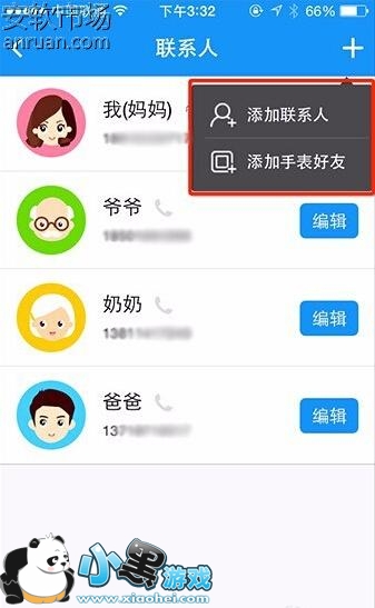 2、点击联系人界面右上角的加号可以添加手表好友或联系人,手表好友指的是添加一个手表的号码到联系人,手表直接可以互相拨打电话。