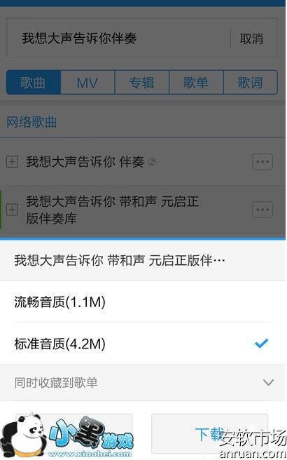 3、查找到以后,我们可以点击试听,如果满意,就点击前方的+号,弹出下载等功能界面,下载时需要选择音质: