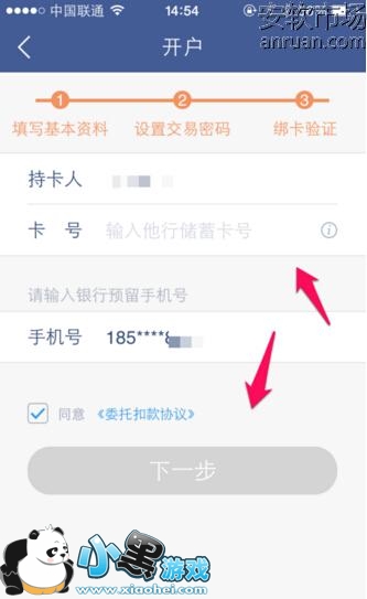 5、设置好密码后,就会进入到开户的最后一个步骤绑卡验证,然后输入你要绑的这张卡的相应信息,包括持卡人姓名,卡号等等。