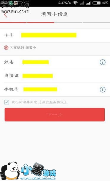 4、银行卡卡号验证通过之后,系统自动进入下一环节——验证身份信息。输入你的姓名、身份证号码、手机号码(注:手机号码必须办卡时在银行留下的手机号码)确认无误后点击下方的“下一步”。