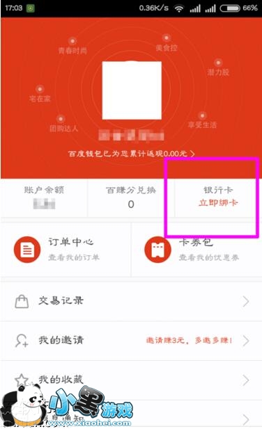 2、进入我的百度钱包界面后,在这里大家可以看到当前账户的一些基本信息,大家可以在账户图像下方看到“银行卡”选项,当前是未绑定状态,点击并打开。
