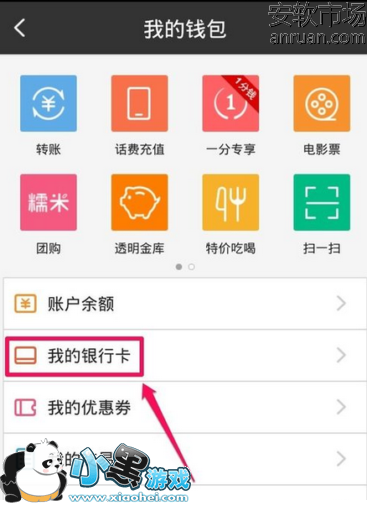 2、在我的钱包界面中找到“我的银行卡”这个功能选项,点击我的银行卡功能进入,如下图。