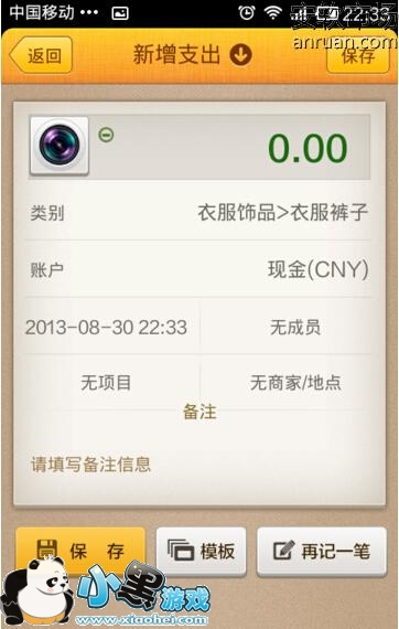 3、进入记账页面后,假如自己现在要记录一次开支情况,可以编辑金额信息,备注信息等,编辑好后点击保存即可。