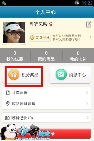 5、进入到个人中心页面以后,其中有一个功能就是积分奖品,点击该功能就可以进入积分兑换的页面了,如下图。