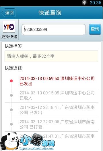 7、当然还有一个功能值得夸赞,那就是我查查查询快递的功能,点击主页面上的快递查询功能进入,就可以看到我们发的快递的运输状况,如下图。