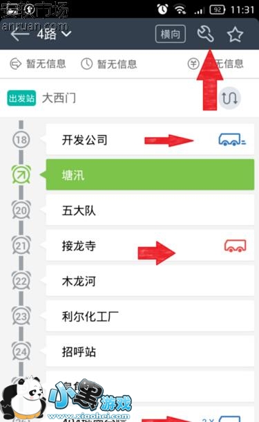 5、有时候,我们希望手机能够不断刷新公交的实时情况,提醒我们公交车到哪了,用什么音乐提醒,还有几站提醒我们,那么我们按软件上面的“扳手图标”这个功能选项,如下图。