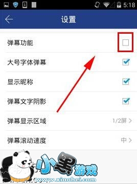 5、点击进入弹幕设置界面后,把弹幕功能右边小框框的勾子给去掉,因为默认情况下弹幕功能是开启的,关闭成功以后,返回到直播界面中,你会发现现在的视频直播节目弹幕消失了。
