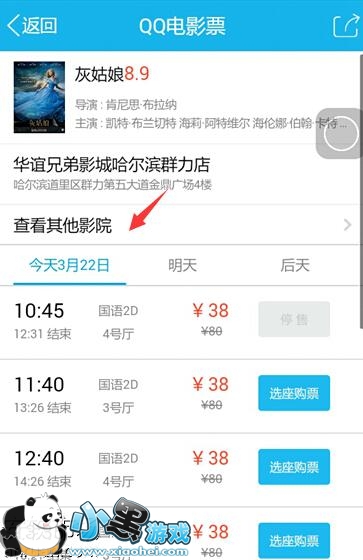 2、点击该电影进入以后,我们可以看到一家影院正在上映的时间,或者可以点击查看其它影院,选择下有没有离我们更近的影院,或是有更便宜的票价的电影院。