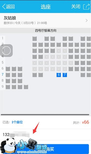 4、选择好要看的电影和时间以后,然后在线选好两个座位,注意是别人没有选的才行,填上接收电子票的手机号,点立即购买。