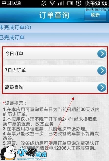 2、点击【订单查询】可以通过今日订单、7日订单、高级查询。查询到你的订单。