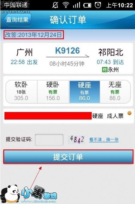 7、提交改签订单。此时还可以更改车票类型:硬坐、硬卧、软坐、软卧。