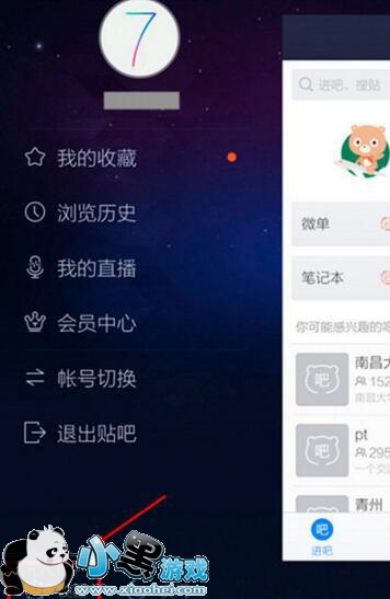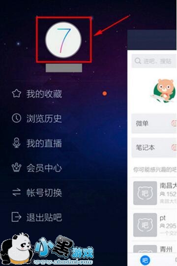 1、首先,下载小黑市场新版的手机百度贴吧,向右滑动唤出左侧菜单,然后点击目前的头像: