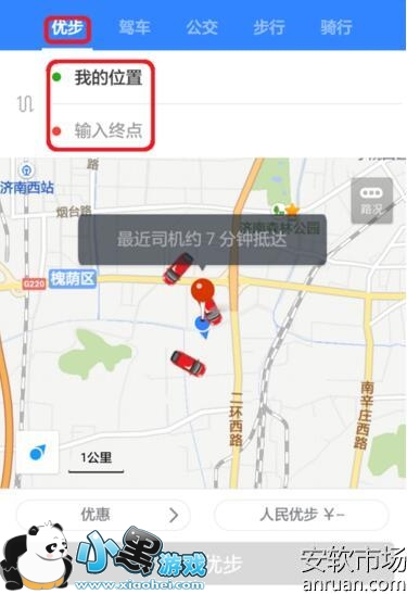 2、进入以后第一个看到的就是优步,我们可以预览附近的司机并设置好出发地点和终点: