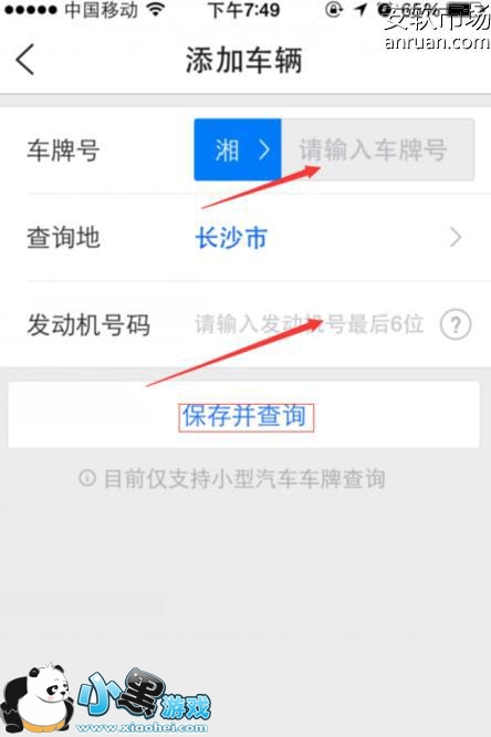 3、进入添加车辆界面以后,输入你的车牌号、查询地及发动机后6位,点击保存并查询。