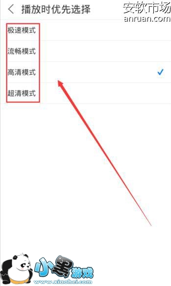 4、进入以后,可以看到一个播放时优先选择的等级,这时候只需要根据你自己的宽带质量选择播放的模式就可以了,选择好以后,返回到主界面中,以后播放的乐视视频就会按照你现在设置的这个播放模式等级给你播放视频资源了。