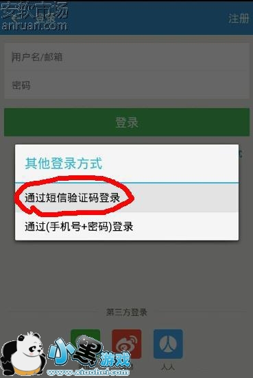 2、点击之后,会弹出一个其他登录方式的选择窗口,其中有两个选项,一个是通过短信验证码方式登录,一个是通过手机号+密码的登录,这么我们选择最上面使用短信验证码登录这个功能,如下图。