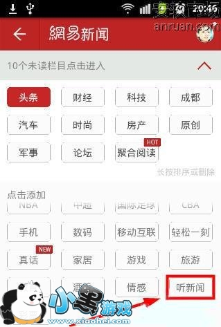 3、进入以后,你可以看到有很多小栏目标签,一直往下拉,就能看到有一个“听新闻”的功能选项,点击该功能添加,如下图。