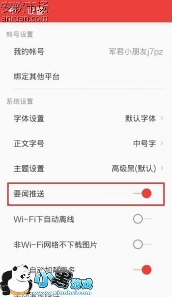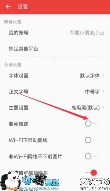 4、进入到设置界面以后,找到“要闻推送”这个功能,然后点击其功能右侧的小圆圈,小圆圈呈现红色的时候表示功能处于开启状态,呈现灰色表示关闭状态,点击该圆圈,如下图。