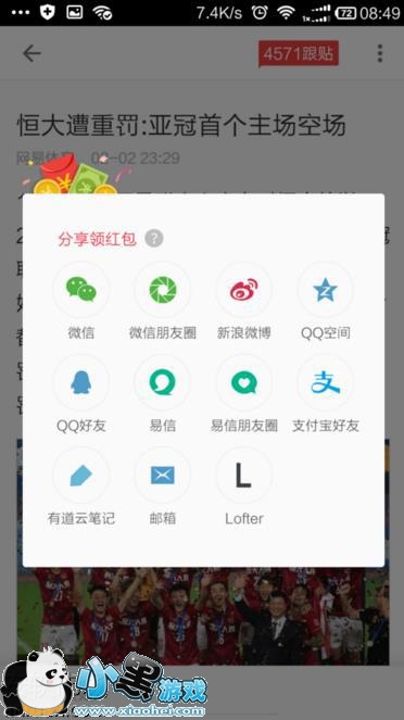 3、点击分享按钮以后,会弹出一个你可以分享出去的社交媒体窗口,随便选择一个进行分享,当你分享出去以后,就可以领到一个红包了。