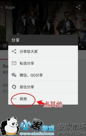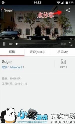 手机下载网易云音乐的高清正版MV教程 1、首先,下载小黑市场新版的网易云音乐,找到我们喜欢看的MV,点击右上角的【分享】按钮: