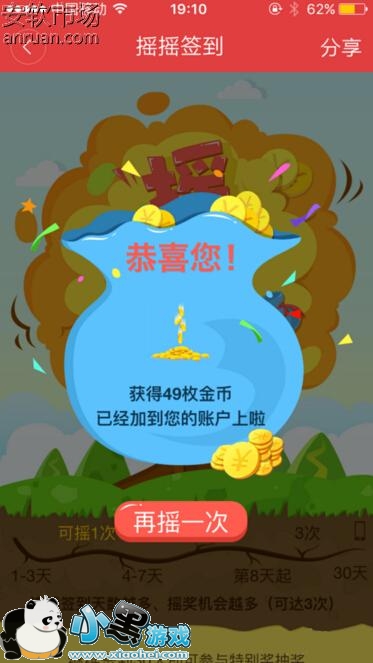 4、进入到“摇摇签到”界面以后,只要我们摇动我们的手机就能获得相应的金币奖励了。