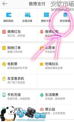 2、进入到微博支付界面以后,在其界面的右上方会有一个积分商城的功能,点击该功能进入,如下图。