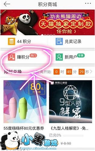 4、当然,如果你的积分不够还不能兑换到你心仪的奖品的话,那就点击积分商城界面中的赚积分这个功能,通过赚取积分再去兑换你要兑换的礼品或者卡券。