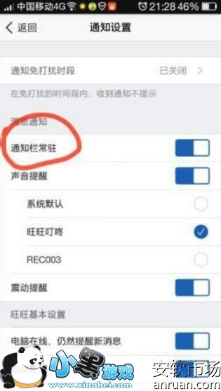 5、当然仅仅设置一个提示音还不够,还要把通知设置界面中的通知栏常驻这个功能开启了才可以,如下图。