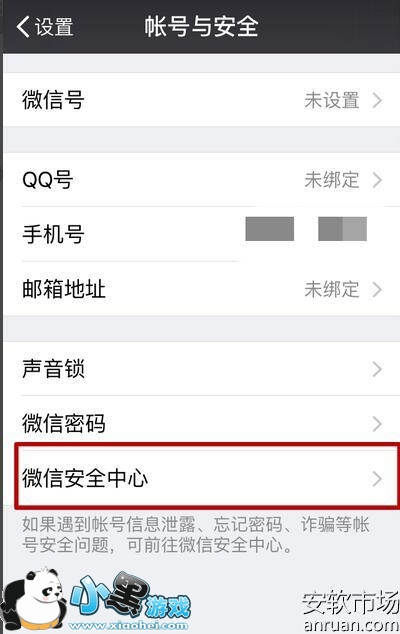 4、在帐号与安全里面选择微信安全中心,一般微信安全中心在最下方。