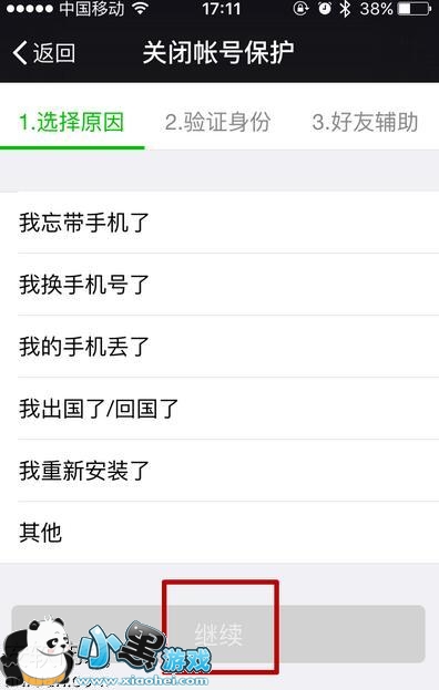 8、接下来,选择您关闭账号管理的原因,然后点击继续,接下来就是验证身份,验证身份需要是手机的后四位,然后继续,然后是好友辅助,按照要求操作即可,完成之后就可以在新设备上登录微信了。