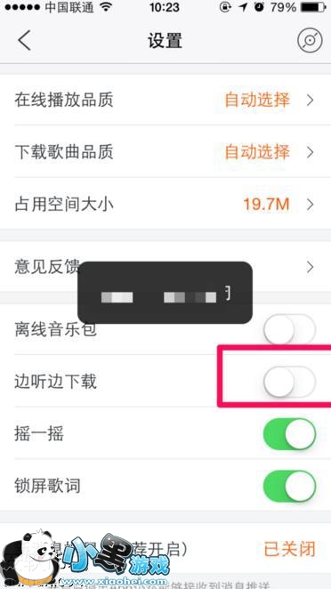 3、进入到虾米音乐设置界面以后,就能在设置界面中看到有一个边听边下载的功能,一般默认情况下这个功能是关闭的,点击这个功能右侧的小圆点处就可以开启这个功能。